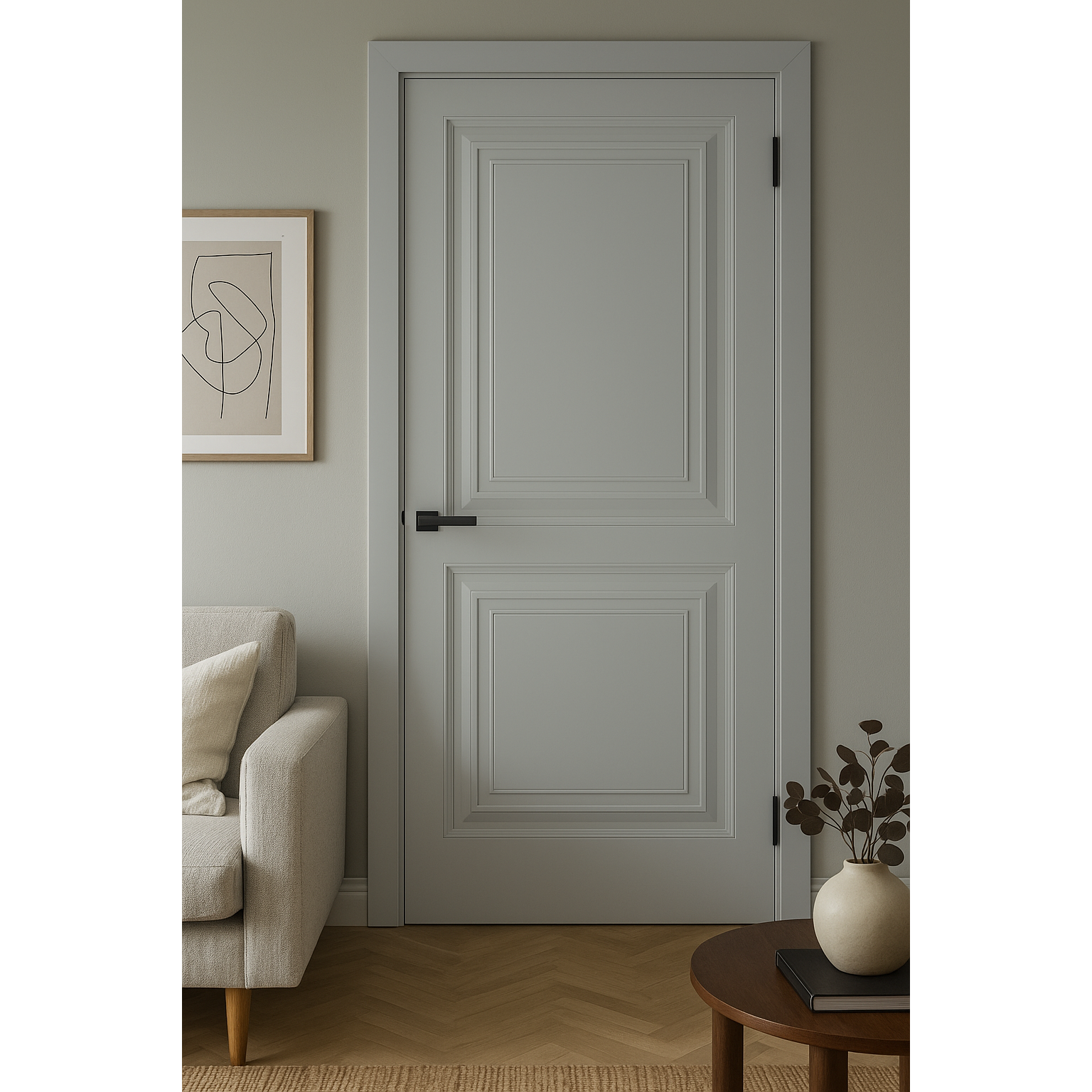 Koka karkasa durvis ar MDF pildiņiem, pārklātas ar matētu PVC plēvi, kas ir glūda un bez tekstūras.